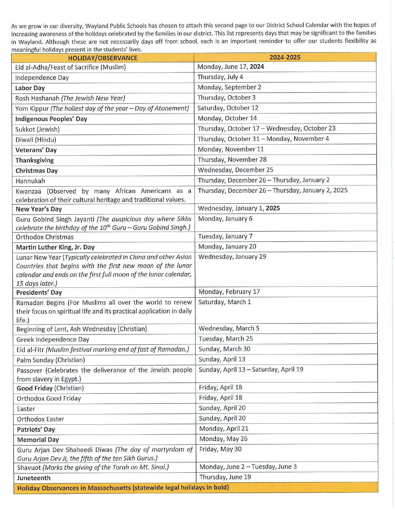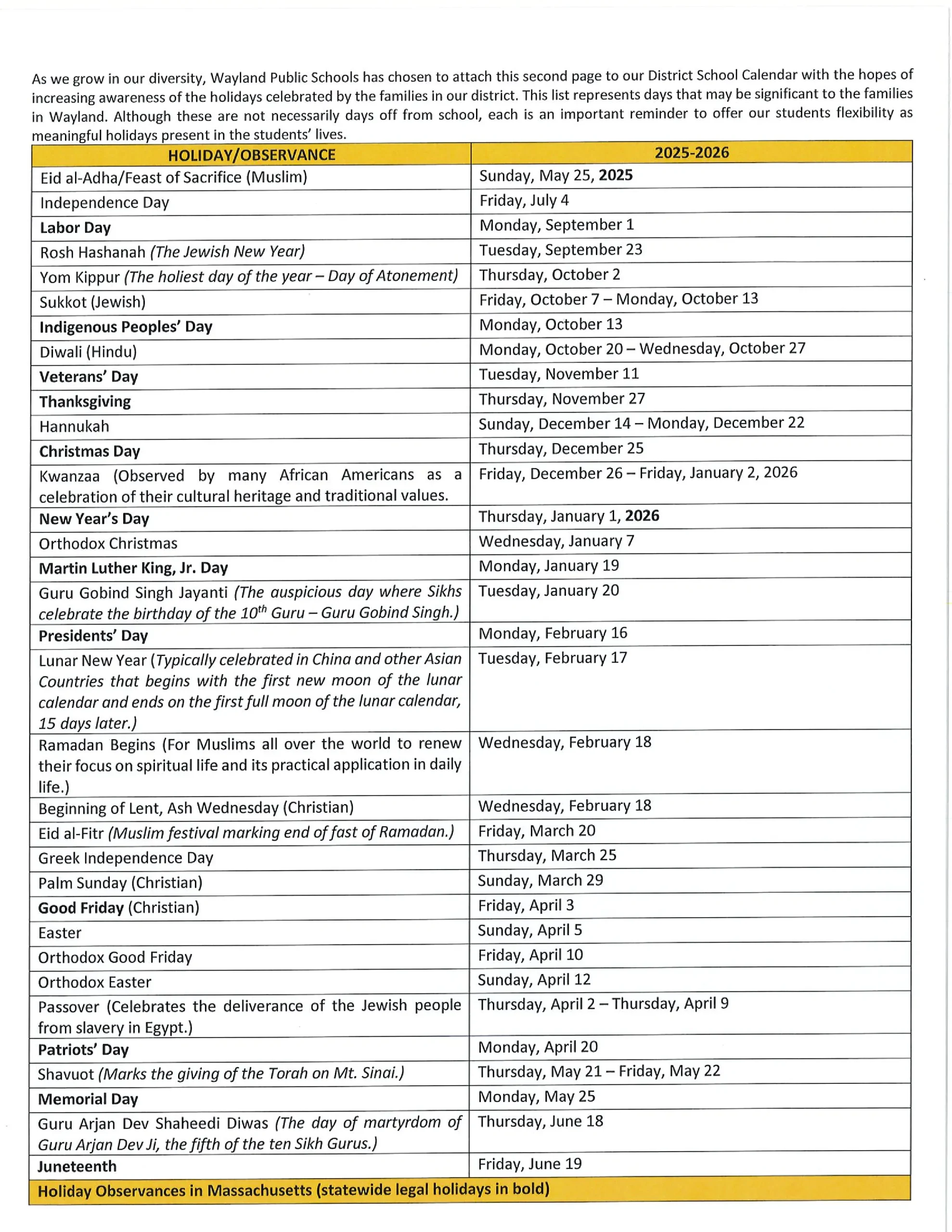 The Wayland Public Schools Calendar Administration is dedicated to fostering an educational environment that supports academic excellence and personal growth for all students. The administration focuses on effective leadership, strategic planning, and collaboration with staff, parents, and the wider community.